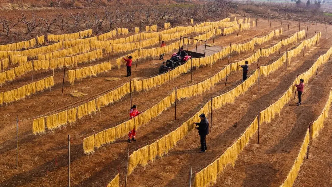 2月4日,春节将至,镇平县遮山镇陈沟村的传统手工粉条迎来销售旺季,农户们抢抓晴好天气晾晒粉条,准备销往市场。张峰 摄