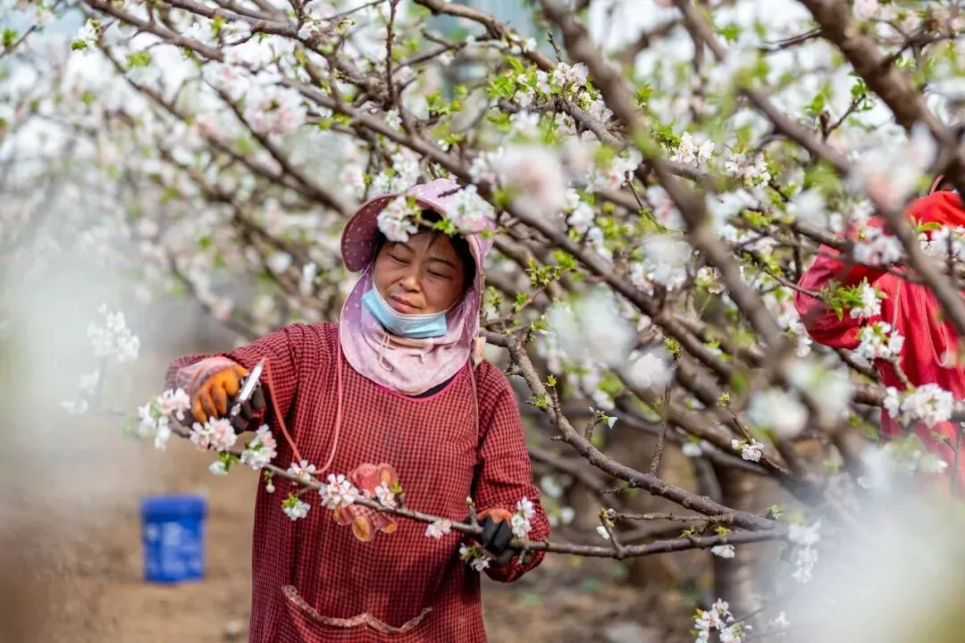 2月5日,安阳市安阳县永和镇兴和生态园的温室大棚内,洁白的樱桃花次第绽放,村民们忙着对樱桃花进行人工喷雾授粉,加强果树花期管理。王建安 摄