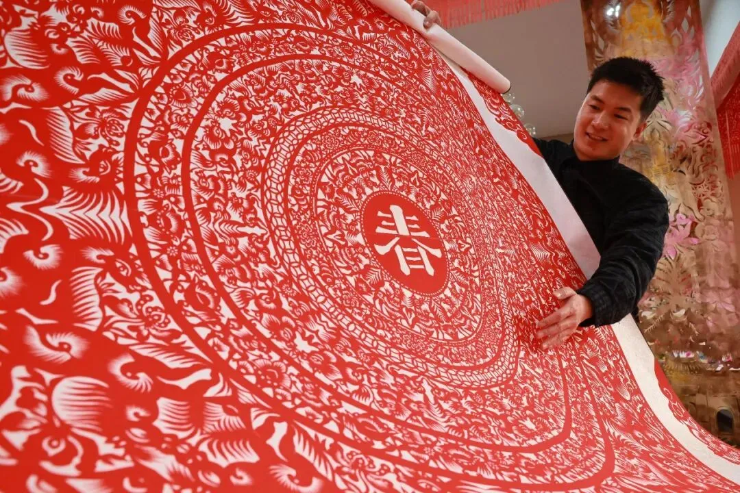2月6日,河南省级非遗孟津剪纸代表性传承人畅杨杨展示大型剪纸作品百马送财。聂冬晗 摄