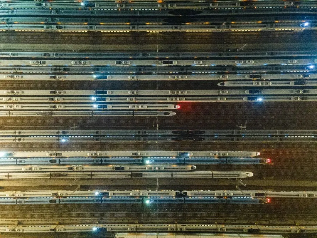 2月1日凌晨,在郑州动车段动车组停车场,百余列高铁整装待发,迎接春运大幕开启。白周峰 摄