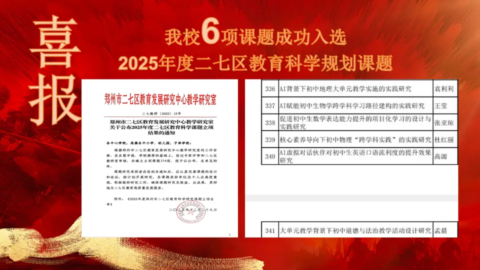 岁序常易,研思不辍;杏坛耕耘,硕果盈香。近日,捷报频传,郑州市二七区教研室公布的2025年二七区教育科学课题立项名单中,郑州市第四十四初级中学有6项课题成功获批立项。