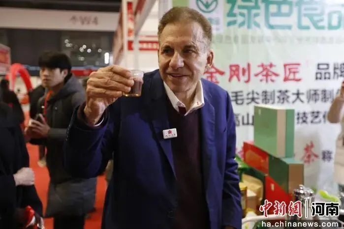 图为约翰·卡萨达现场品尝河南信阳毛尖茶。陈贵洋 摄