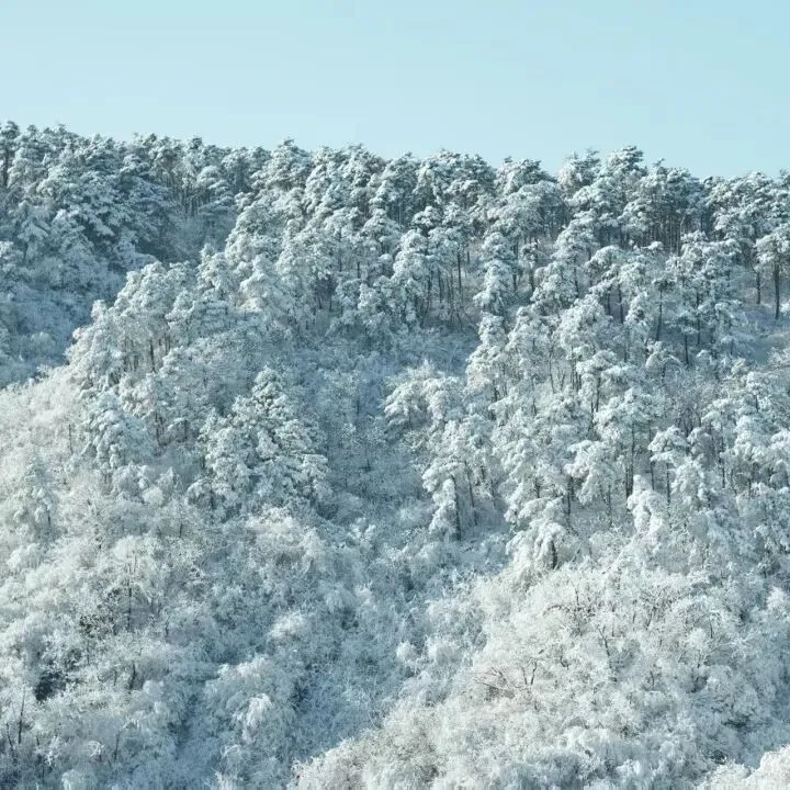 嵩顶森林公园的冬日,藏着一场可遇不可求的盛宴——漫山雾凇。当雪花飘飘、气温骤降,整片松树林便被晶莹的冰晶包裹,宛如凝固的云雾,将山野幻化为纯净的冰雪秘境。