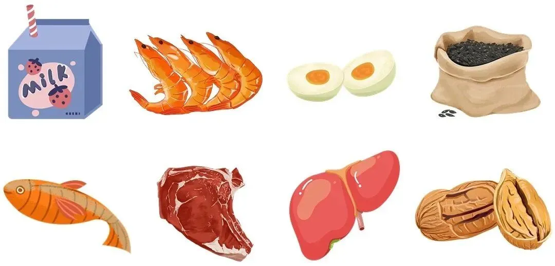高钙食物:牛奶、虾皮、芝麻、鸡蛋;