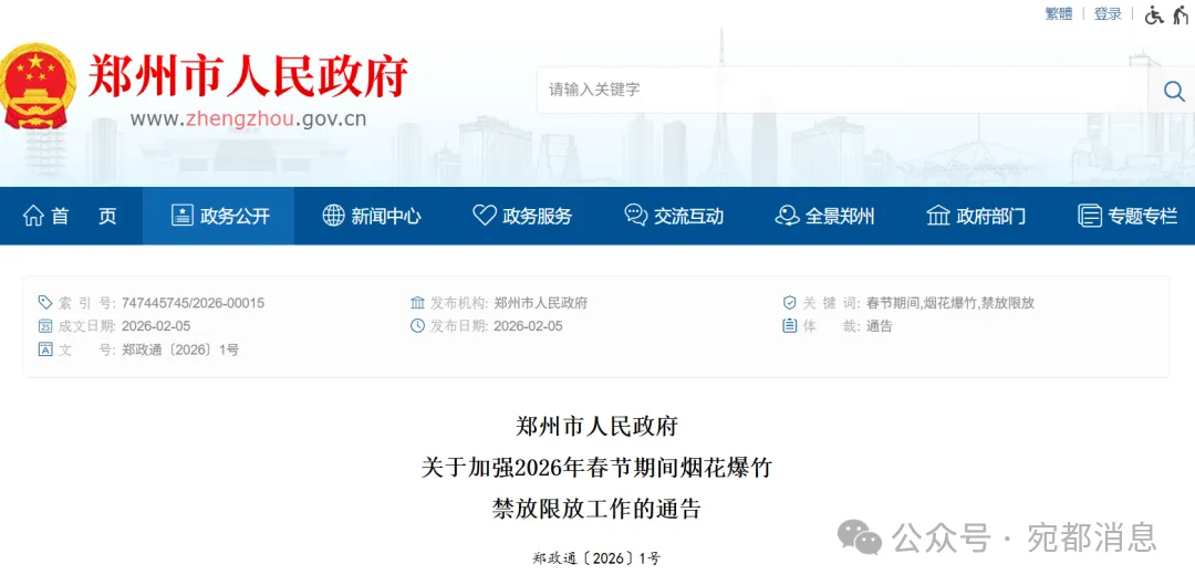 为加强2026年春节期间烟花爆竹管理工作,回应社会关切,减少大气环境污染,保障公共安全和群众人身、财产安全,确保春节期间烟花爆竹安全形势稳定,根据《烟花爆竹安全管理条例》(2016修订)和《河南省大气污染防治条例》等规定,结合我市实际,现就进一步做好我市2026年春节期间烟花爆竹禁放限放有关工作通告如下: