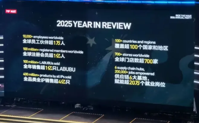 2月6日晚,泡泡玛特创始人王宁在其公司年会上披露,2025年泡泡玛特全球员工伙伴超1万人、注册会员超1亿人、LABUBU全年销量超1亿只、全品类全IP产品销量超4亿只,业务覆盖超100个国家和地区、全球门店超700家、拥有6大供应链基地。