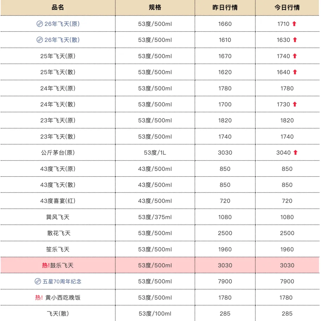 2月7日,据第三方平台“今日酒价”披露的批发参考价显示,26、25年飞天茅台全线上涨,原装单价均突破1700元/瓶。