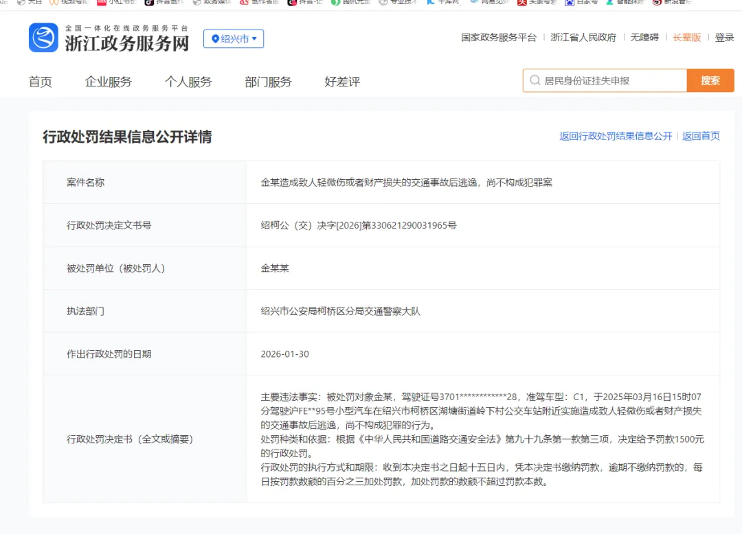 演员金晨交通事故处罚结果公开:罚款1500元,金某造成致人轻微伤或者财产损失的交通事故后逃逸,尚不构成犯罪。