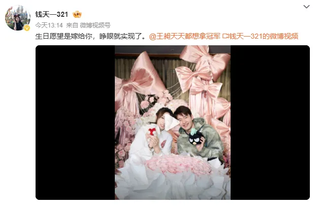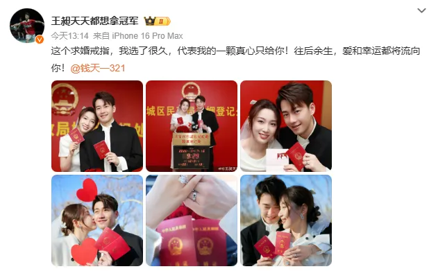 2月7日,国羽选手王昶与国乒选手钱天一官宣领证结婚。王昶发文表白:往后余生,爱和幸运都将流向你;钱天一晒求婚视频:生日愿望是嫁给你,睁眼就实现了。