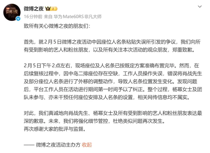 2月7日,微博之夜主办方再次就座位争议道歉:工作人员操作失误,将肖战及部分座位人名条外移,杨幂及团队未参与、干预,相关网传信息均不属实。