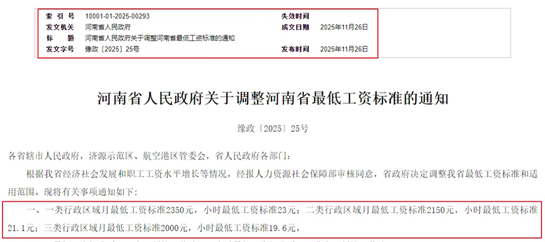 先来看看河南省最低工资标准,根据官方2025年11月文件说明:河南一类行政区域月最低工资标准2350元(各地市区);二类行政区域月最低工资标准2150元(大部分县市);三类行政区域月最低工资标准2000元(个别县城)。