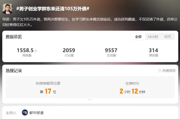 从负债百万到成功翻盘,于先生的故事一经报道,迅速引发网友强烈关注,并登上了全国热搜榜。