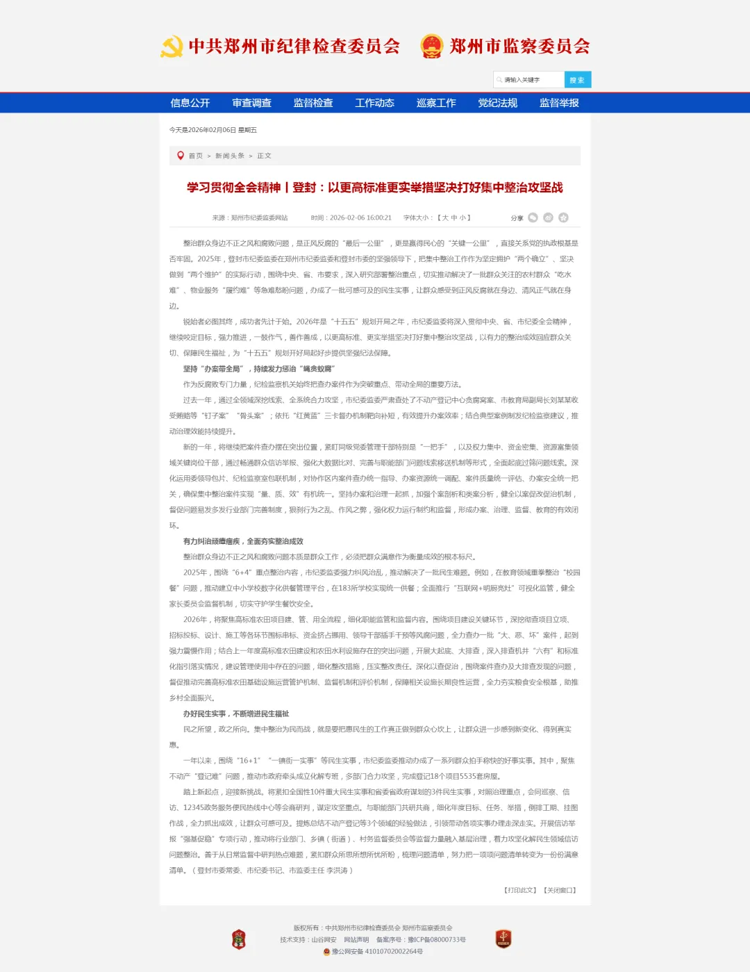 郑州市纪委监委网站刊发登封市委常委、市纪委书记、市监委主任李洪涛署名文章《以更高标准更实举措坚决打好集中整治攻坚战》。
