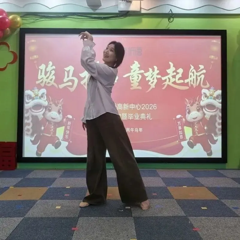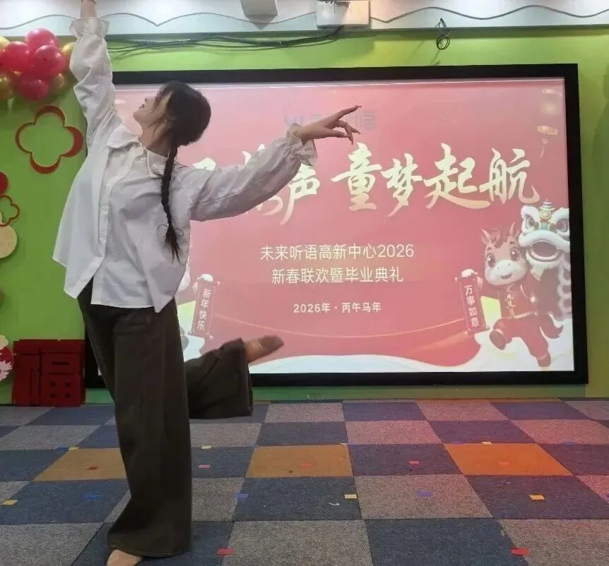 活动伊始,未来听语集体课教师们带来活力满满的开场舞《马年style》,动感的节奏、欢快的舞姿瞬间点燃全场气氛,完美契合马年主题,正式拉开这场年终毕业典礼暨新春联欢会的帷幕,现场掌声与欢呼声即刻响起。