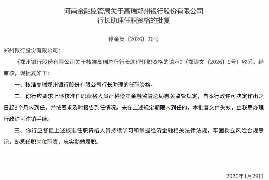 国家金融监督管理总局河南监管局于2026年1月30日发布公告,核准高瑞担任郑州银行行长助理的任职资格,批复日期为2026年1月29日。