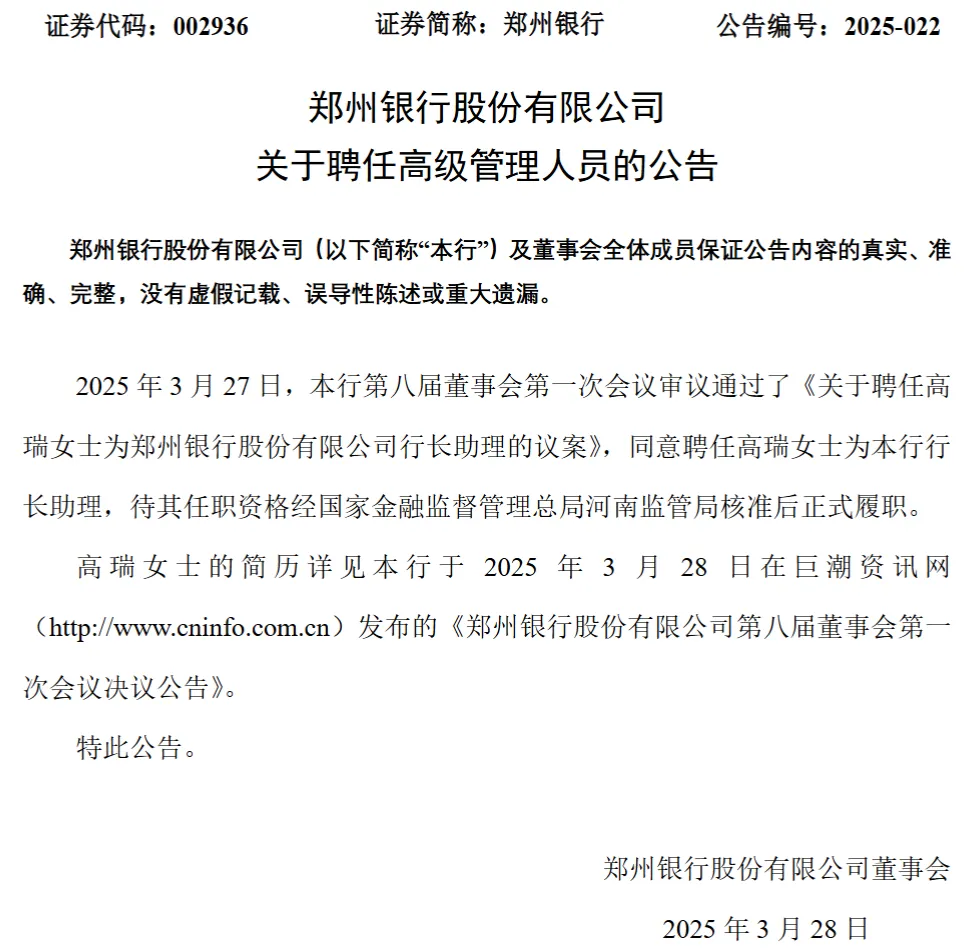 根据郑州银行此前发布的《郑州银行股份有限公司第八届董事会第一次会议决议公告》,该行董事会早在2025年3月27日就已通过聘任高瑞为行长助理的议案。从董事会审议通过到监管核准,前后历时约十个月。