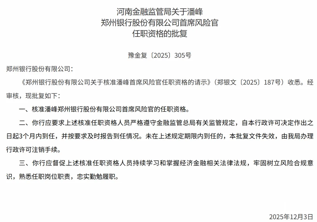 在此高瑞任职资格获批之前,该行首席风险官潘峰的任职资格于2025年12月获得核准。