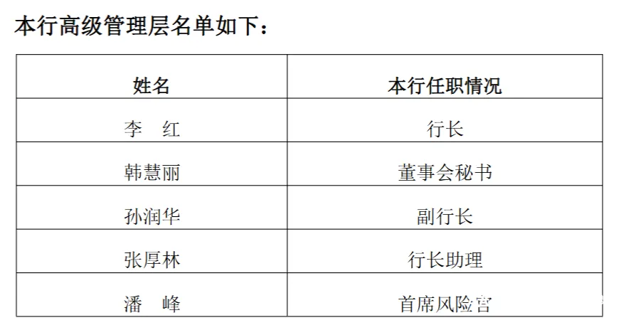 据郑州银行官网“企业治理”栏目公布的管理层名单,目前该行高级管理层包括行长李红、副行长孙润华、董事会秘书韩慧丽、首席风险官潘峰、行长助理张厚林和新获批的高瑞。