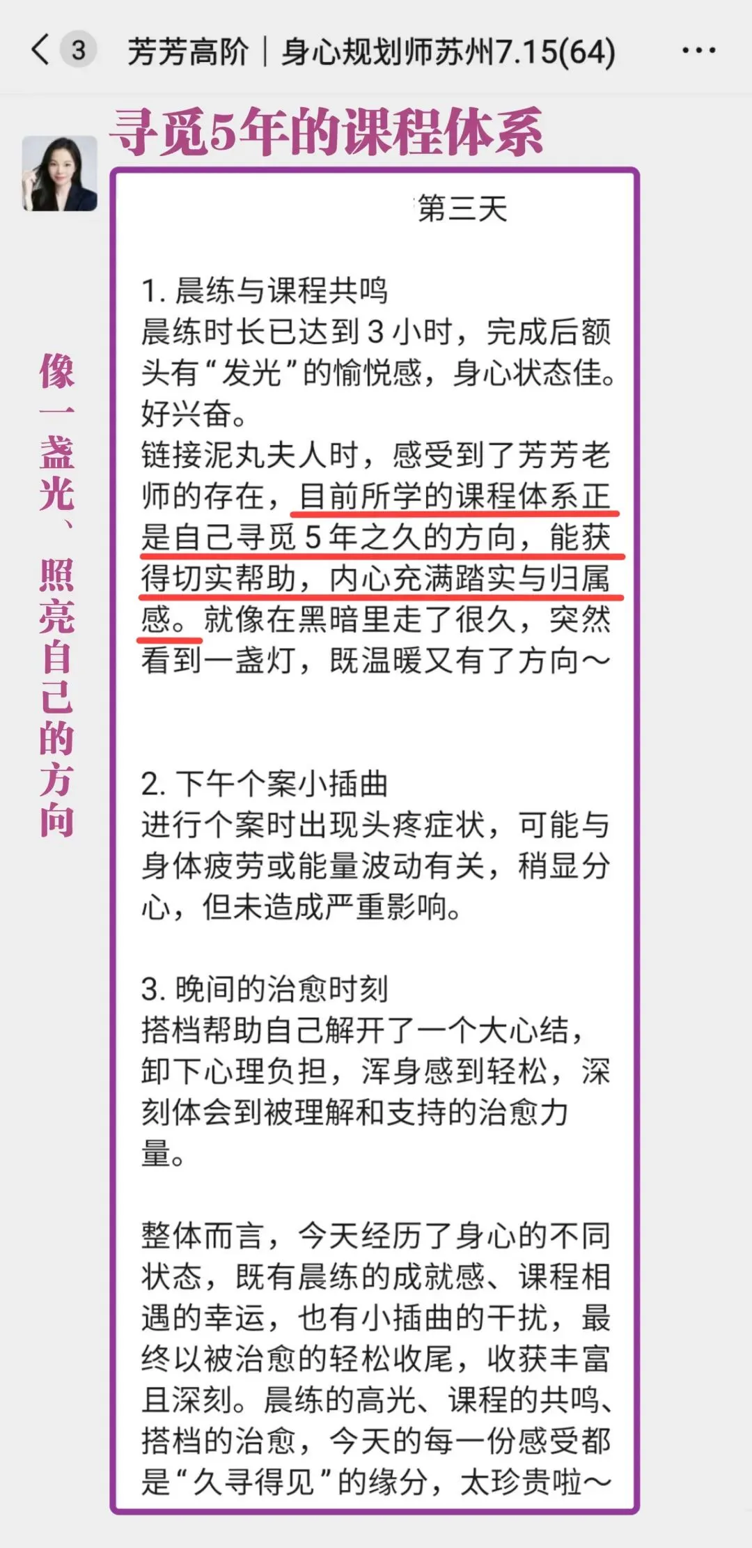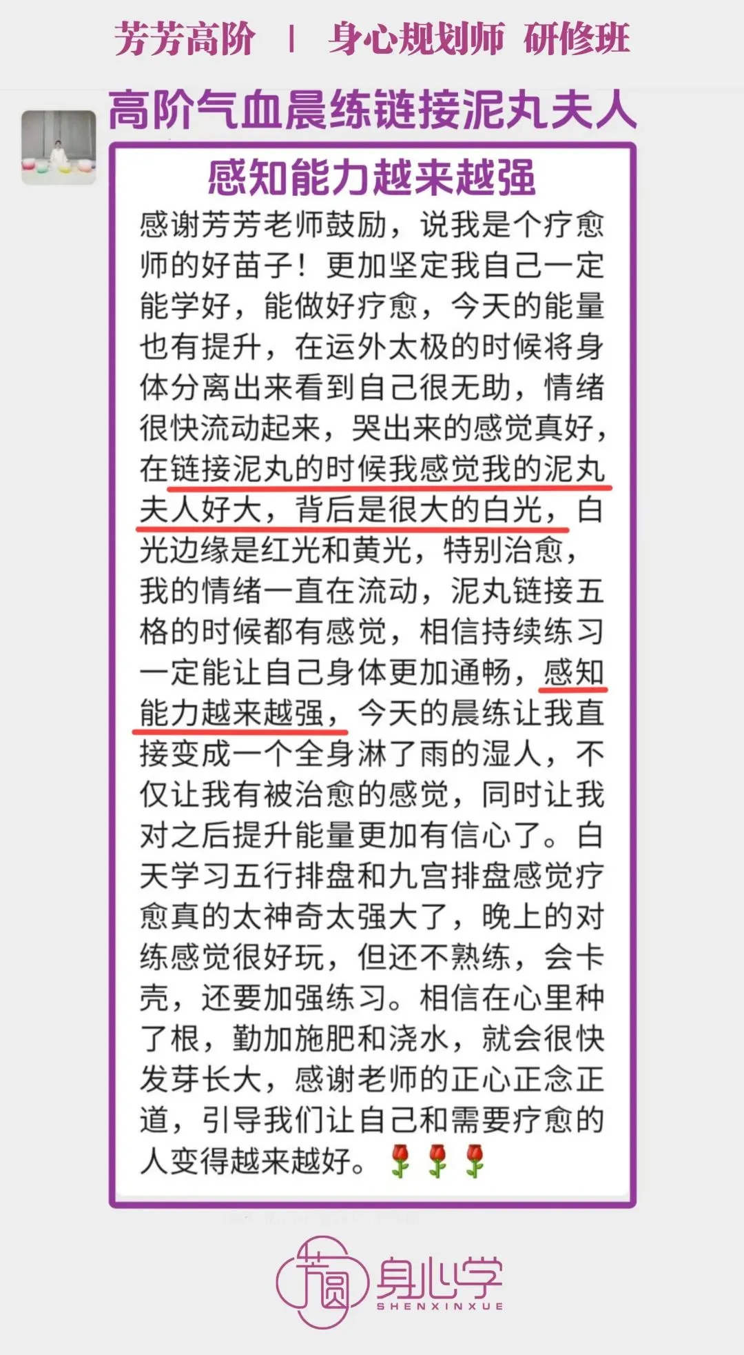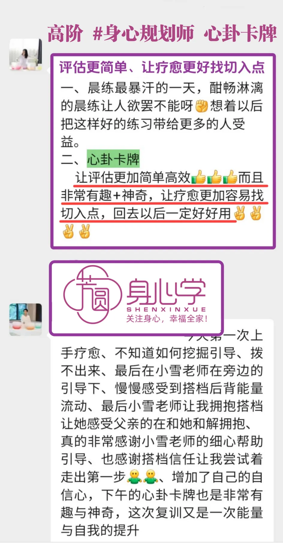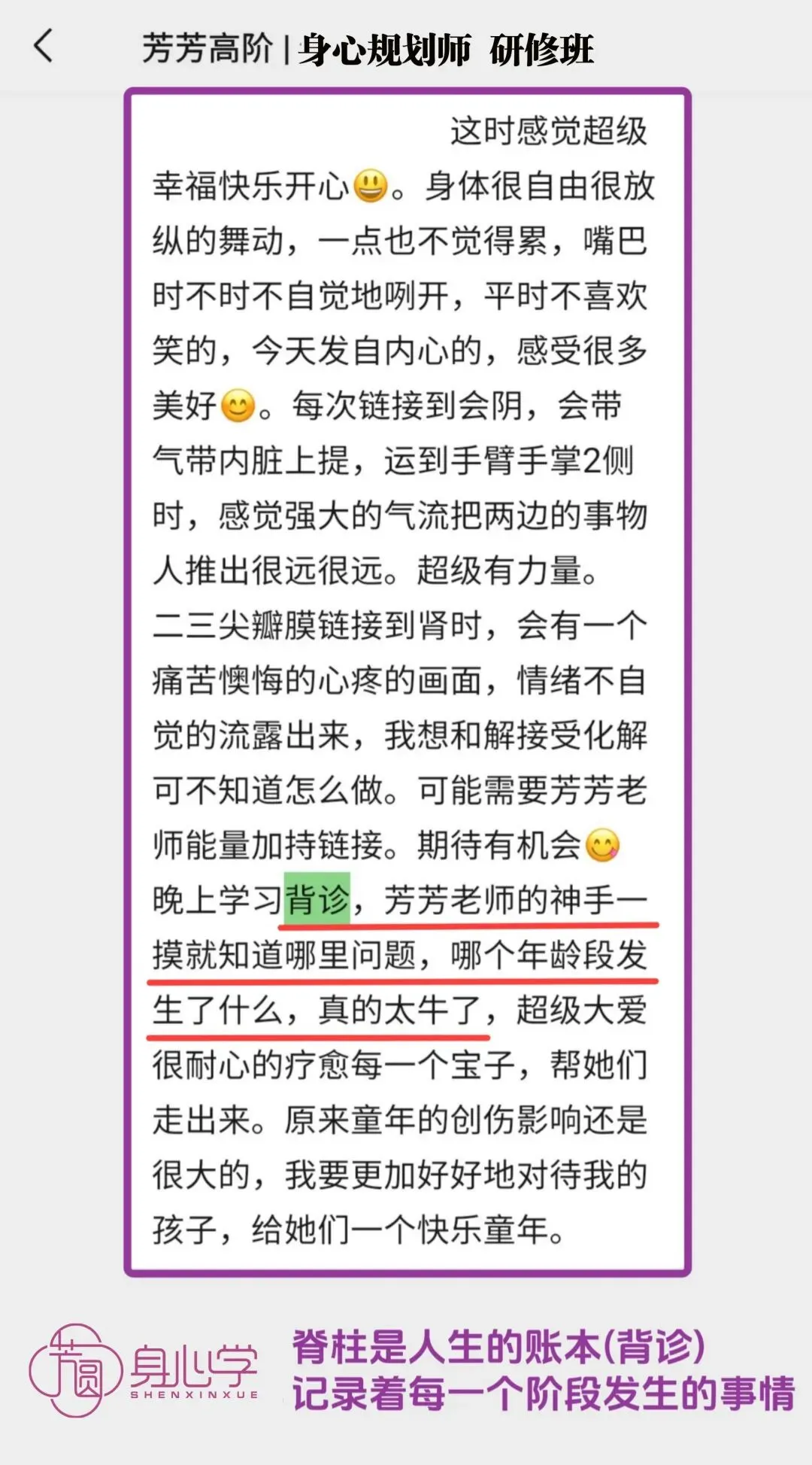 高阶《身心规划师》已经被芳芳老师立项,是被官方认证的培训项目。其所包含的气血调理训练模块和系统的疗愈方案,目前在国内10万元内的培训中基本找不到内容如此清晰,身心结合全面发展的疗愈课程。