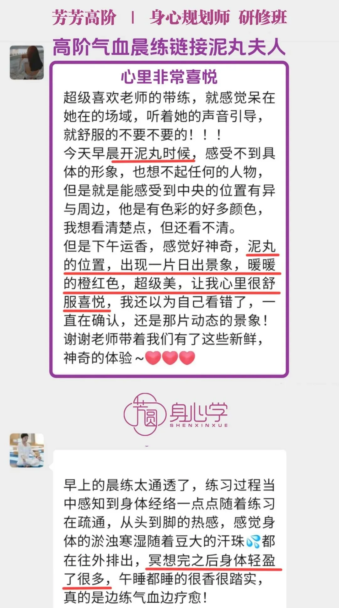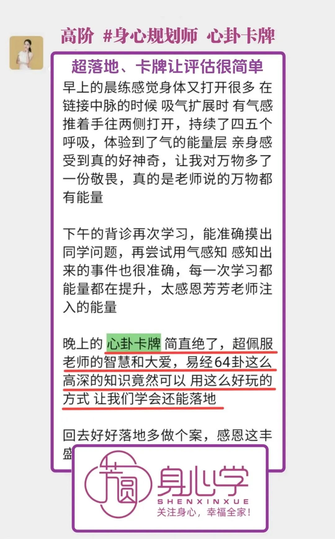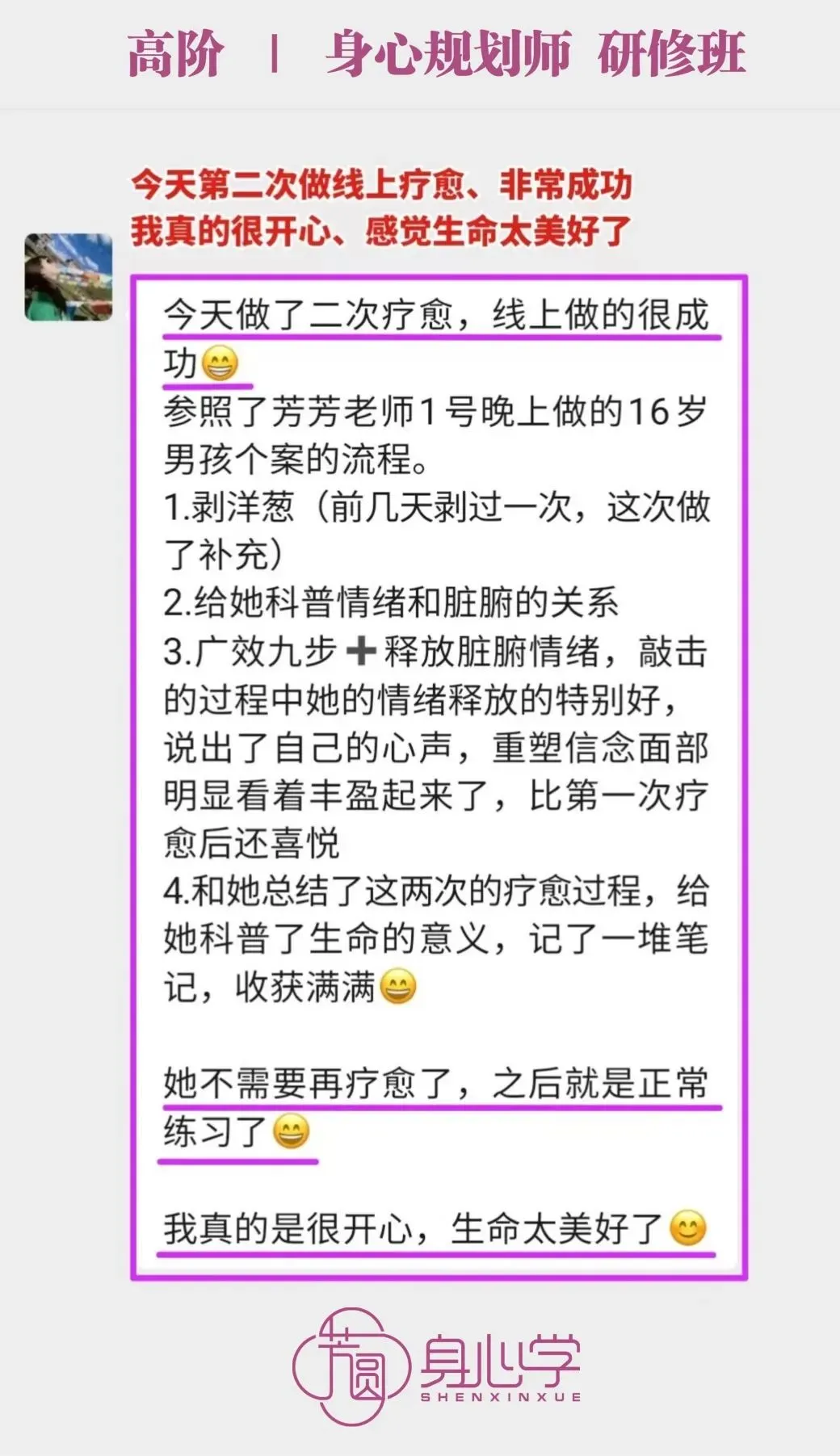 高阶《身心规划师》已经被芳芳老师立项,是被官方认证的培训项目。其所包含的气血调理训练模块和系统的疗愈方案,目前在国内10万元内的培训中基本找不到内容如此清晰,身心结合全面发展的疗愈课程。