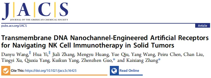 郑州大学张开翔、郭振振团队构建了一种工程化纳米平台,该平台搭载跨膜 DNA 纳米通道工程化人工受体,通过两种协同机制引导自然杀伤细胞靶向实体瘤:1)肿瘤微环境重编程:借助胆固醇介导的膜插入作用,该人工受体整合至肿瘤细胞膜上,破坏磷脂双分子层,诱导肿瘤细胞发生免疫原性细胞死亡并释放损伤相关分子模式,进而重塑免疫抑制性肿瘤微环境,募集并活化自然杀伤细胞;2)精准靶向:该人工受体通过碱基配对,与自然杀伤细胞表面工程化修饰的 DNA 纳米人工配体形成可编程的合成免疫突触。这种不依赖抗原的组装网络构建了通用型膜界面,实现自然杀伤细胞对肿瘤的持续性靶向活化。该双组分系统可使自然杀伤细胞在肿瘤内实现持续性蓄积,时长超 96 小时,活化型 NKP46+GZB + 自然杀伤细胞数量较对照组提升 15.1 倍。该研究将 DNA 纳米技术与细胞免疫疗法相结合,搭建的纳米平台为调控肿瘤 - 免疫相互作用提供了通用策略,有效解决了过继性自然杀伤细胞免疫疗法治疗实体瘤的关键瓶颈问题。该工作以“Transmembrane DNA Nanochannel-Engineered Artificial Receptors for Navigating NK Cell Immunotherapy in Solid Tumors”为题,发表在JACS期刊上。