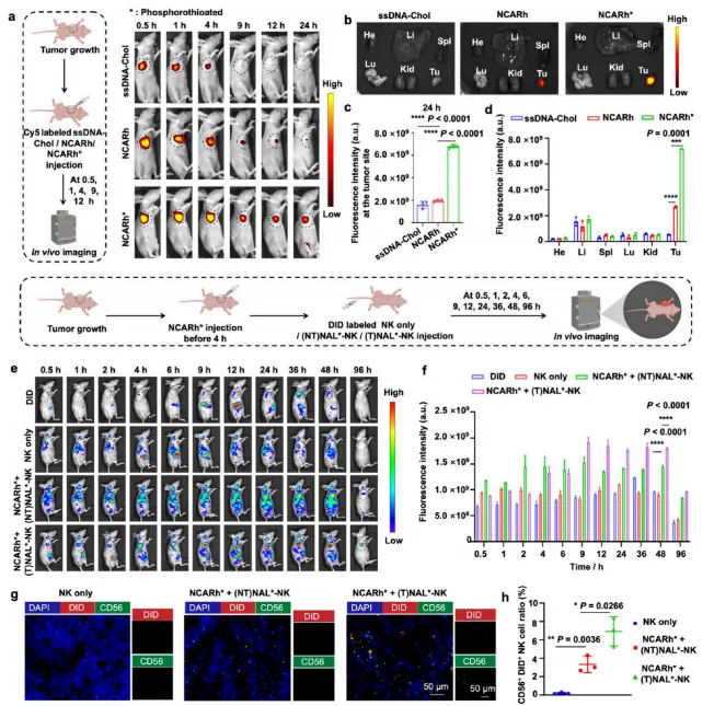 长效肿瘤滞留:硫代磷酸酯修饰的NCARh*在肿瘤部位保留时间延长6倍(>96小时),实现NK细胞持续招募。