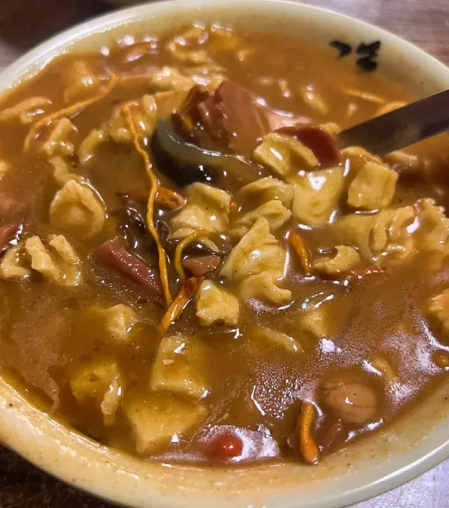 特别是那一碗胡辣汤。不是那种稀汤寡水的,而是浓稠得挂勺。深褐色的汤底里,牛肉丁、面筋、木耳挤得满满当当。早起犯困的时候,端起来喝一口,胡椒的辛辣瞬间在舌尖炸开,顺着喉咙一路烫到胃里,额头上微微冒汗,人一下子就醒了。配上两根刚出锅的油条,蘸着汤吃,酥脆吸满汤汁,那滋味,给个神仙都不换。