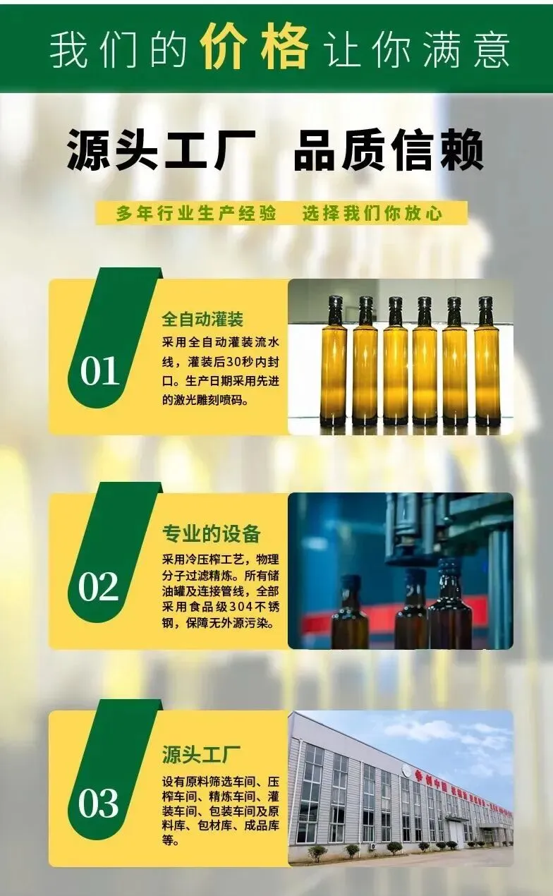 生产标准严苛:采用全封闭洁净车间和自动化灌装产线,从原料处理、生产加工到成品灌装,全程实行严格的质量管控,以标准化生产流程守护每一滴油的品质。