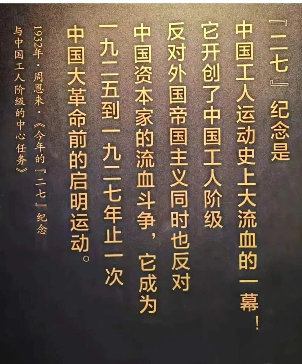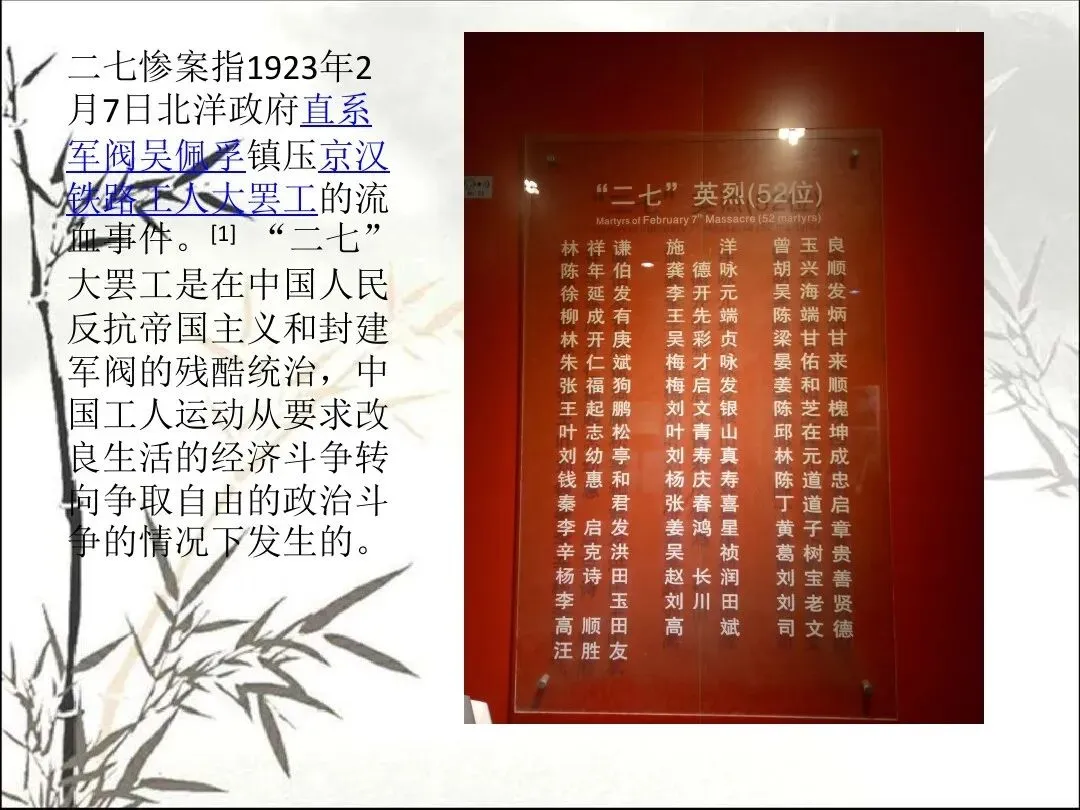 1923年2月1日,中国共产党领导京汉铁路工人,成立了京汉铁路总工会,遭到北洋军阀吴佩孚的武力阻挠。