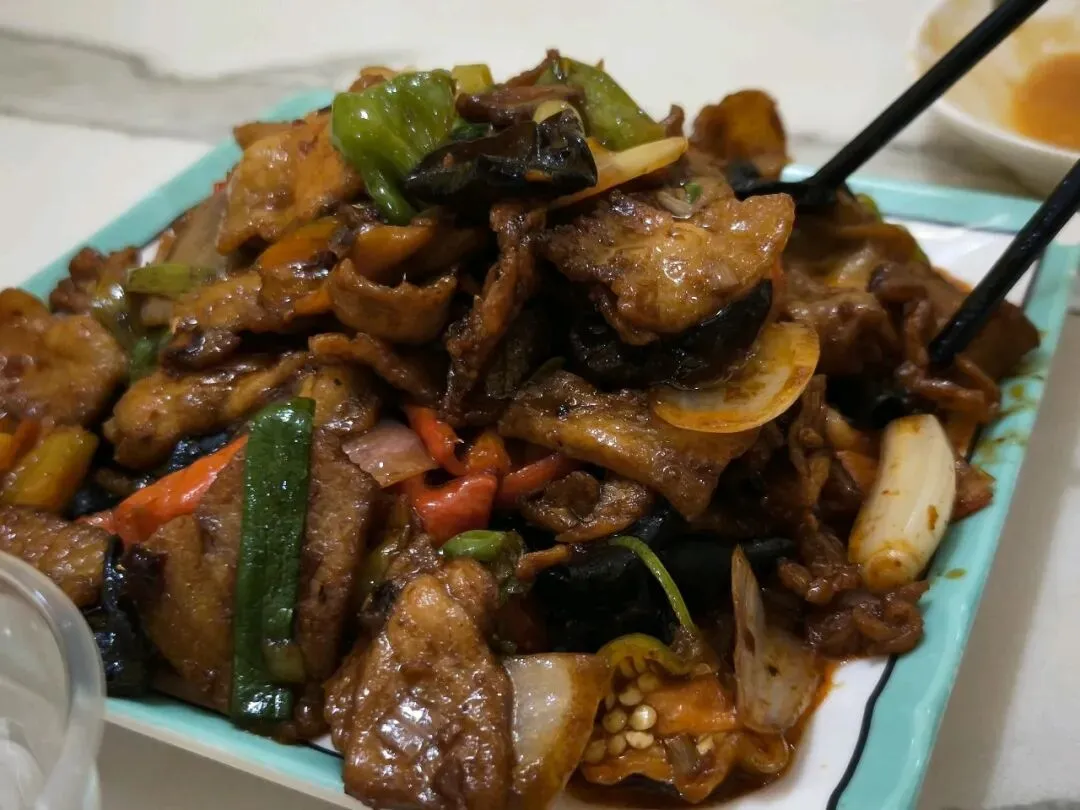 这样的菜很容易让人倒回到二十三年前,不管什么菜,都要有木耳、洋葱和青红辣椒,好像这才是厨师的花活点缀,只有这样,他的菜才能端出去,也只有这样,他的菜才能先声夺人。