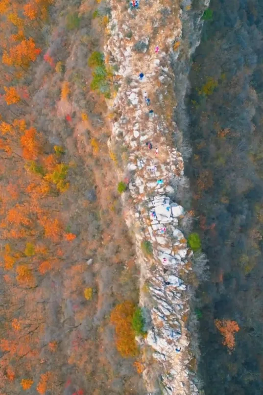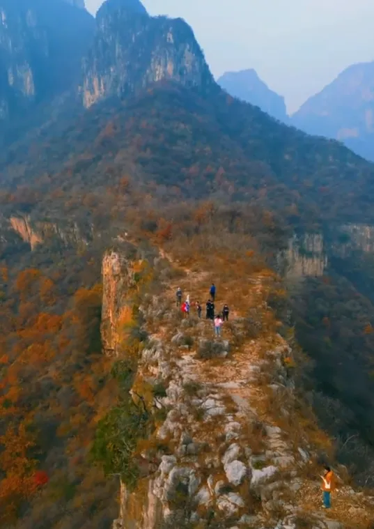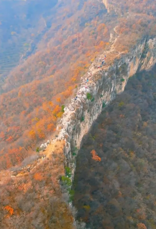 三尺崖,堪称南太行最惊险刺激的自然奇观。这是一道长约两三百米的窄山脊,最窄处仅容一人通过,两侧是垂直落差达300米的悬崖峭壁。远远望去,它如同一道天然屏障横卧在群山之巅,宛如一条搁浅的"诺亚方舟",气势磅礴,令人叹为观止。