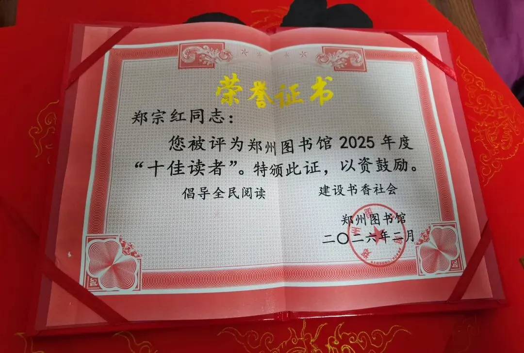 获评郑州图书馆2025年度十佳读者,