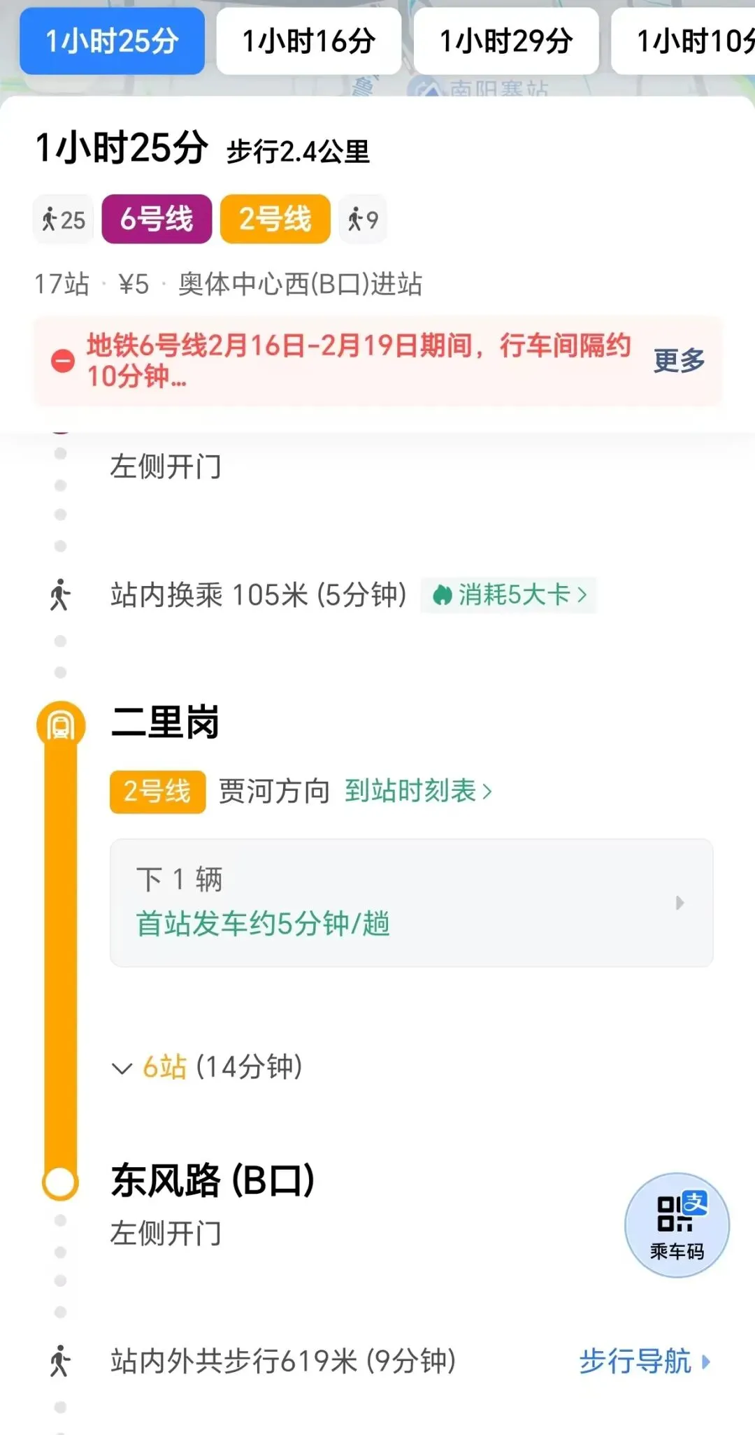 中间通过6号线转2号线,如果完全不用等车的情况下,地铁总共需要46分钟,也就是大概50分钟。