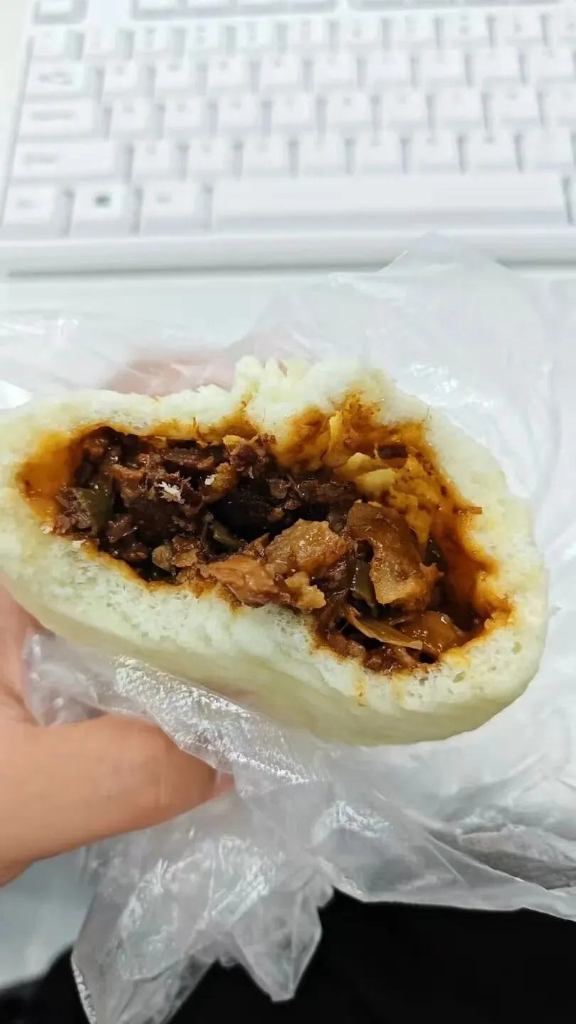早餐只能在楼下匆匆买两个包子、一杯豆浆,带到公司再吃。这个是之前买的梅菜扣肉馅儿。