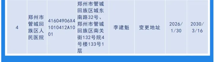 >郑州市管城回族区人民医院变更地址被许可,当前法定代表人为李建魁