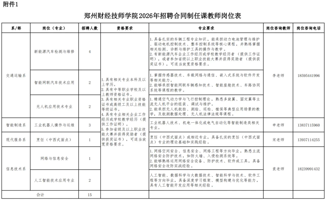本次招聘合同制任课教师15名,具体岗位及要求详见《郑州财经技师学院2026年招聘合同制任课教师岗位表》(附件1)。招聘外聘兼职教师19名,具体岗位及要求详见《郑州财经技师学院2026年招聘外聘兼职教师岗位表》(附件2)。