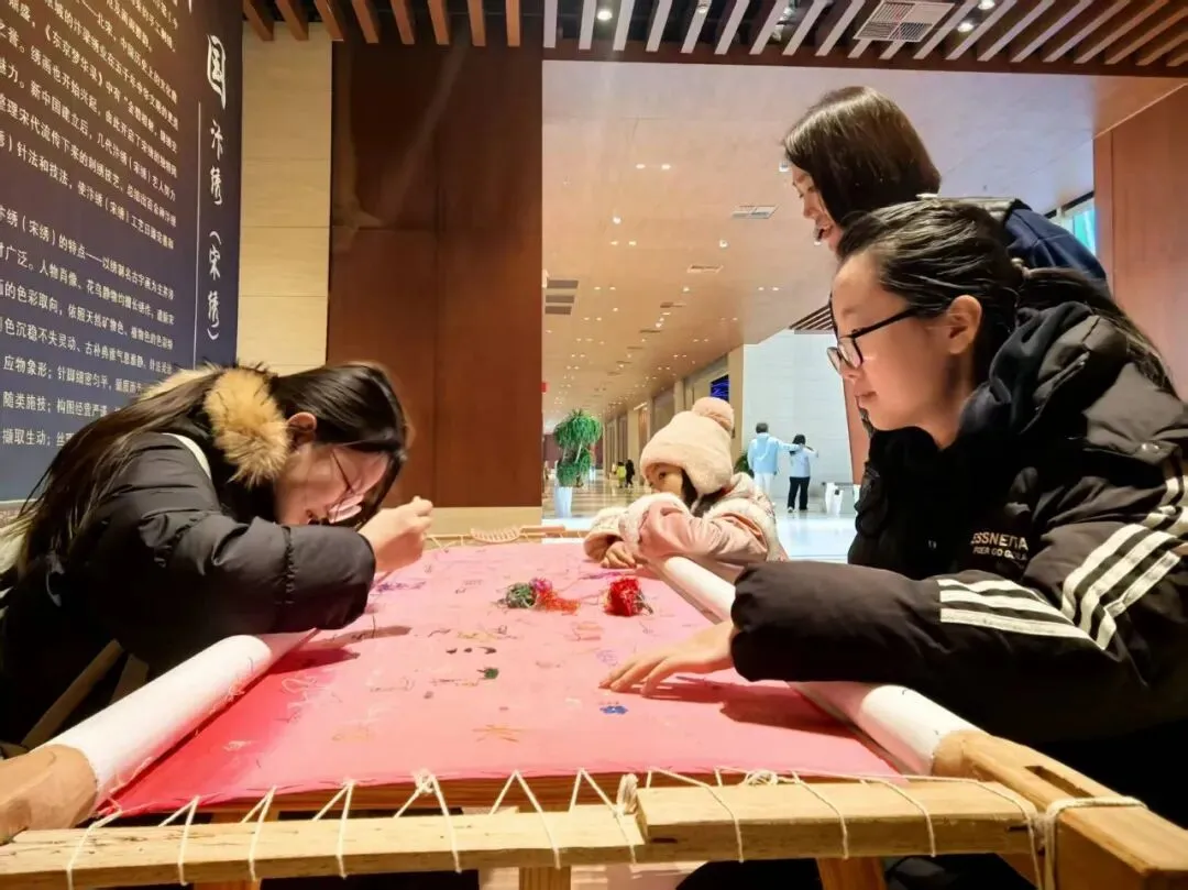 队员们还在互动板块再次体验了宋绣技艺,看似简单的菊瓣绣制,实操起来却困难重重:丝线细软难以控制,“晕针”技法难以掌握,稍不留神就会扯断丝线。这让队员们更加敬佩传承人的坚守——每一件精美绣品的背后,都是数十年如一日的练习与付出,是对技艺的敬畏与执着。