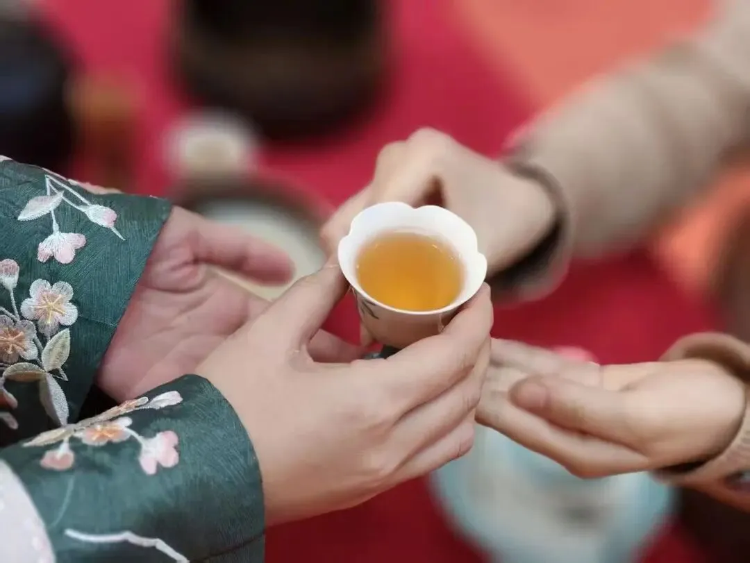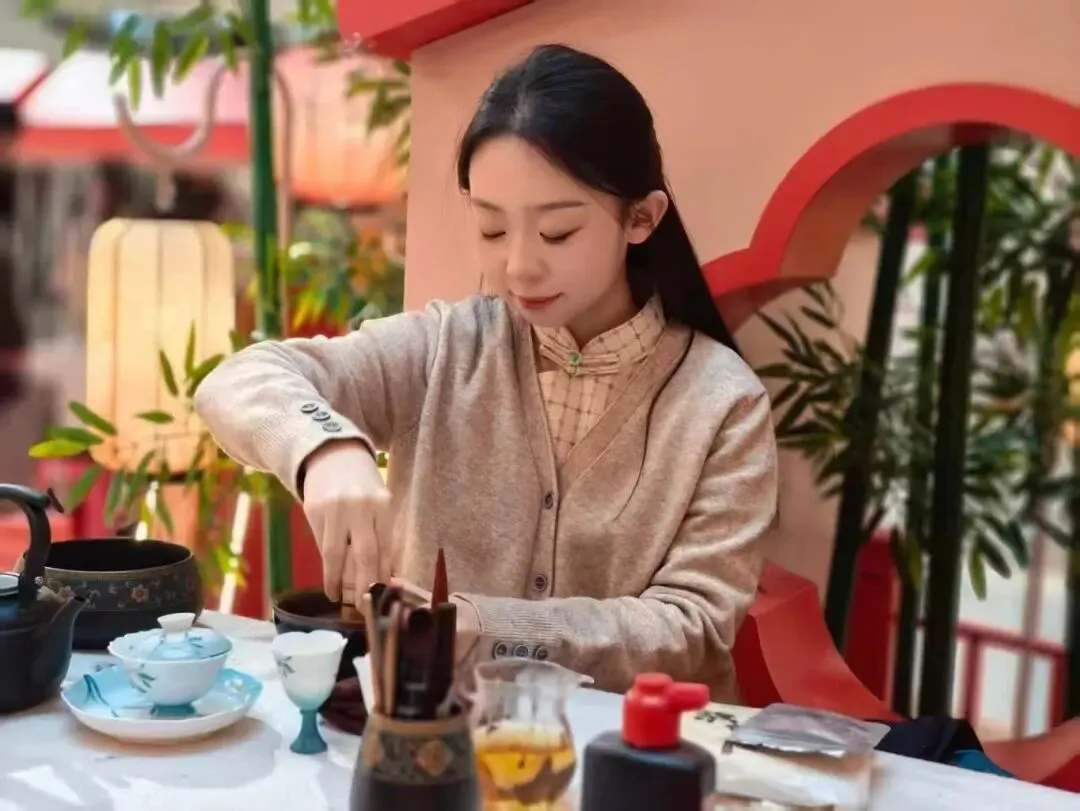 现场,杨一诺仪态端庄、神情专注,从容演绎了宋代点茶与盖碗技艺。其动作如行云流水,精准而沉稳,充分展现出扎实的专业功底与从容的现场掌控力。表演吸引众多观众驻足观赏,赢得阵阵赞叹。