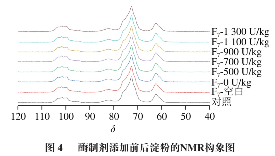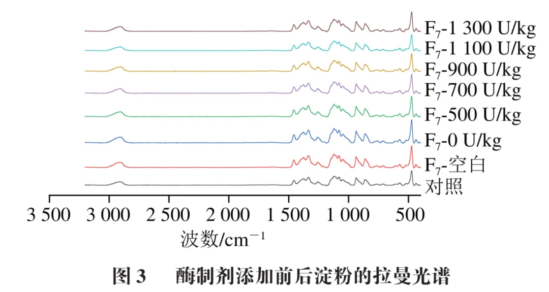 激光共聚焦显微镜通过特异性荧光标记技术,可直观显示冷冻生胚面团中淀粉与面筋蛋白复合体系的分布特征,其中,绿色代表淀粉颗粒,红色代表面筋蛋白。从图1可以看出,经过冻融循环后,F7-空白面团内部的淀粉颗粒与面筋蛋白之间发生明显的相分离,且二者之间的断裂现象明显。这可能是由于冰晶生成及重结晶产生的微机械力持续作用于“面筋蛋白-淀粉”基质,导致基质间或内部存在的氢键、疏水相互作用等次级键断裂,从而导致原本嵌入面筋网络结构的淀粉颗粒暴露,二者出现明显的相分离。酶制剂可有效改善“面筋蛋白-淀粉”基质的稳定性,且随着α-淀粉酶添加量的增加,“面筋蛋白-淀粉”基质的有序化程度呈现先增强后降低的趋势,其中添加量为900 U/kg时,冻融面团内部的面筋网络与淀粉颗粒形成稳定界面,具有良好的微观结构完整性和稳定性,表明酶制剂的添加可显著抑制冻融对其面团微观结构的破坏。相关变化一方面可能源于TG能够催化面筋蛋白形成共价交联,构建高强度弹性网络,其拓扑缠结密度的增强使面团的微观结构在冻融过程中不容易受到破坏;另一方面,α-淀粉酶能够破坏淀粉的链结构及其超分子结构的排列规整性,甚至特异性水解淀粉分子链生成糊精及低聚糖,其产物通过渗透压调控与调控冰晶形成减缓冰晶的破坏效应,且淀粉酶解形成的柔性链段可填充蛋白网络缺陷,共同形成具有互锁效应的稳定基质。然而,当α-淀粉酶添加量过多时(>900 U/kg),淀粉内部结构破坏严重,其可与面筋蛋白发生竞争性吸水,从而破坏“面筋蛋白-淀粉”基质结构的稳定性。淀粉的短程有序结构通常是由直链淀粉和支链淀粉的短侧链形成的螺旋结构,尽管整体呈现无序状态,但局部区域存在有序的排列。图2为酶制剂添加前后淀粉的傅里叶变换红外光谱。通常,800~1 200 cm―1范围内的去卷积光谱可有效表征淀粉分子的短程有序性,其中,1 045 cm―1处的特征峰强度反映了淀粉分子的有序化结构微区,而1 022 cm―1处的特征峰则与无定形淀粉的含量有关,因此常用R1 045/1 022值表示淀粉的短程有序化程度。由表2可知,添加α-淀粉酶后,冻融淀粉的R1 045/1 022值由0.93下降至最低0.79,表明其短程有序性降低。这可能是因为α-淀粉酶的加入和冷冻面团内部“水-冰”相态的转变诱导淀粉分子内或分子间氢键的破坏,这种分子构象的调整使得淀粉颗粒内部有序性降低。此外,淀粉短程有序性与双螺旋结构相关,而α-淀粉酶的水解作用通过减少长链淀粉含量,阻碍双螺旋结构的形成,导致支链淀粉簇状分支的松散化,进一步削弱其有序度,表现为R1 045/1 022值的下降。由图3可以看出,所有淀粉样品的拉曼光谱特征峰清晰可见,且峰的位置基本一致,表明冻融循环以及酶制剂添加并未引起淀粉相关基团的变化。前人研究表明,拉曼光谱480 cm―1处半峰宽值(FWHH)的变化可表征淀粉的短程有序化结构,其FWHH值越大则表明淀粉的短程有序化程度越低。由表2可知,酶制剂添加后,淀粉的FWHH值由16.94增加至最大19.22,这是淀粉分子内的有序化排列以及紧密程度被破坏的综合体现,表明冻融循环与酶制剂的加入使淀粉分子间的短程有序化程度降低,这与R1 045/1 022值的变化一致。图4为酶制剂添加前后淀粉的NMR图谱,其图谱中δ 94~105和81~84处的吸收峰分别代表淀粉葡萄糖单元中的碳原子C1和C4的吸收峰。C1区的振动强度可以反映淀粉晶体区的排列与规整度,C4区可以反映淀粉颗粒中的无定形程度,因此通过计算C1和C4的峰面积,可得到双螺旋、单螺旋和无定形区的相对含量。由表3可知,与原淀粉相比,冻融循环处理后淀粉的双螺旋结构比例下降至36.2%,单螺旋结构和无定形区比例分别增至4.3%和59.5%。这可能因为冻融循环可显著影响冰晶的形成与重结晶,从而导致分子内部氢键在反复冻融过程中被破坏,导致双螺旋结构的解旋与离散,引起双螺旋比例下降;与此同时,冰晶生长和融化过程中产生的机械应力迫使断裂链段重排为单螺旋构象或无序堆叠状态,淀粉颗粒内部逐渐形成更多松散区域,分子排列从高度有序向局部无序转变,最终表现为双螺旋结构含量的降低以及无定形片段比例的增加。酶制剂添加后,淀粉的双螺旋结构相对含量由36.2%降低至最低30.5%,无定形区相对含量由59.5%增加至最高60.1%,这可能归因于α-淀粉酶对淀粉分子链的破坏作用,导致其双螺旋结构发生解聚,逐步转化为无序的无定形区域;且结晶区被降解、短链分子的运动能力增强,以及低分子质量糊精的空间干扰效应,共同促进淀粉链段趋于无序排列。此外,部分柔性淀粉链段在分子内氢键的驱动下发生定向折叠,自发形成单螺旋结构,最终使双螺旋结构转变为单螺旋与无定形片段共存的状态。淀粉的热特性直接影响面团加工性能及终产品品质。如表4所示,冻融循环处理后,淀粉的糊化起始温度(To)、峰值温度(Tp)、终止糊化温度(Tc)及糊化焓(∆H)均呈下降趋势,这是冰晶机械作用驱动的结果,即冰晶的形成及重结晶可破坏淀粉内部的短程有序化结构、双螺旋构象等超分子结构,从而导致淀粉颗粒容易吸水膨胀且刚性下降,最终降低冻融淀粉的热特性参数。加入酶制剂后,尽管整体表现为下降趋势,但其糊化温度呈现波动性变化,这可能是酶解作用使淀粉分子链的断裂,使其内部结构的异质性降低,颗粒内部应力分布更均匀,加热过程中呈现同步化的吸水膨胀行为,