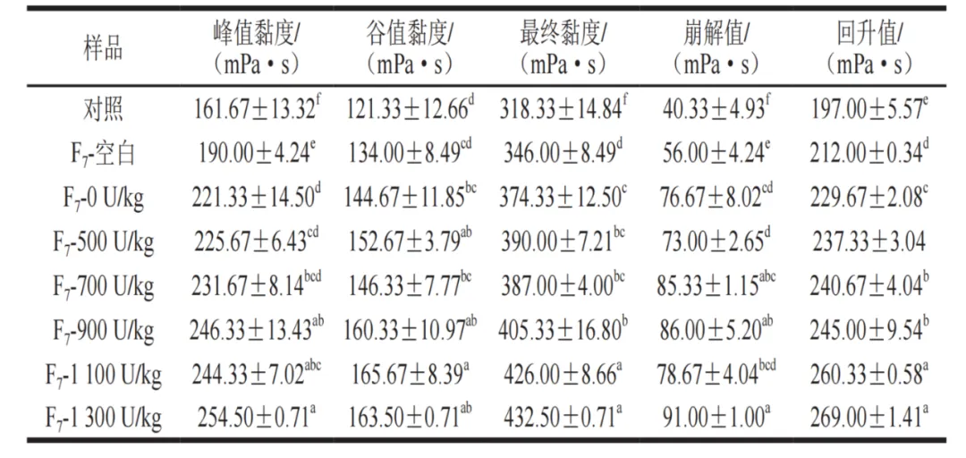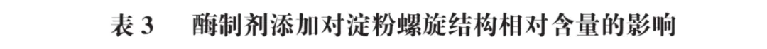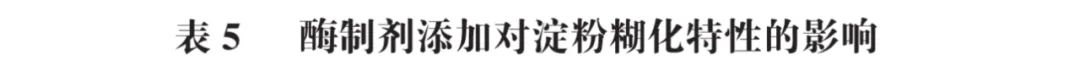 表5为酶制剂添加前后冻融淀粉糊化特性的变化规律,与原淀粉相比,冻融淀粉的峰值黏度和回生值都有不同程度的增加,这可能是由于冻融处理破坏了淀粉的短程有序化结构、双螺旋结构等规整排列的超分子结构,从而有利于柔性淀粉链容易吸水膨胀,导致峰值黏度升高。此外,反复冻融可导致“水-冰”相态的不断转变,而随着水分物态的变化,部分柔性淀粉链释放出来,互相之间通过形成大量氢键,促使淀粉链发生重排,最终表现为回生值的增加。酶制剂添加后,淀粉的特征糊化特性值呈现整体上升的趋势,且随着α-淀粉酶的添加,其变化更为明显,其中回生值的增幅尤为显著,其作用机制可能源于α-淀粉酶对淀粉分子结构的双重调控。一方面,α-淀粉酶通过靶向水解支链淀粉的分支区域(α-1,4-糖苷键),释放出短链直链淀粉片段,这些短链分子因长度缩短而迁移性增强,在冷却阶段更易通过氢键重排形成致密缔合结构,从而强化分子间相互作用并加速回生进程。另一方面,酶解产生的低聚糖与糊精作为可溶性组分,通过羟基与水分子及淀粉链段形成多重氢键网络。这种动态作用不仅能够优化分子扩散路径,还可通过“桥接效应”促进支链淀粉残余簇与直链片段的协同重结晶。