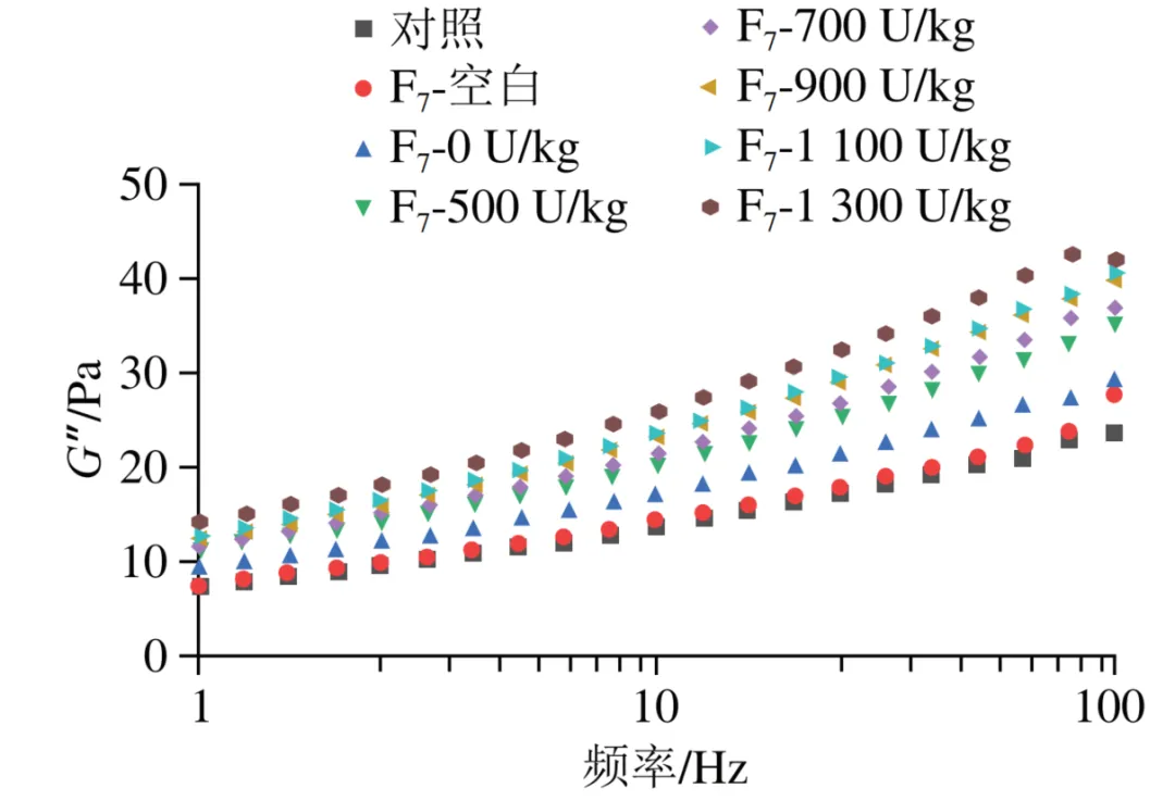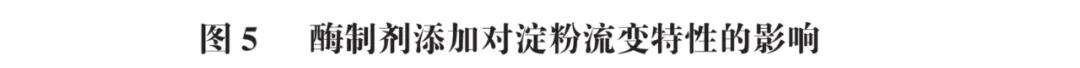 淀粉流变特性(储能模量G’与损耗模量G”)通过调控分子链间的相互作用促进基质复杂网络结构的形成,能够直接影响面团的持气能力与结构稳定性。如图5所示,与原淀粉相比,冻融循环提升了淀粉的G’和G”,这可能由于冻融循环导致淀粉有序化结构的破坏与断裂,提高了分子链的柔性与自由度,促进了淀粉分子间的相互作用和氢键的重新形成,从而提升淀粉凝胶的黏度与弹性。而冻融面团中添加酶制剂后,淀粉凝胶的弹性和黏性都有所增加,这可能是由于酶解破坏了淀粉的分子有序化结构,使其分子链发生降解,而疏松的分子有序化结构有利于淀粉凝胶内部聚合物分子链之间的相互作用和缠结,增强其凝胶网络结构的稳定性和刚性,从而导致G’和G”的增加。此外,短链分子互相之间容易发生聚集或重排,且酶解产生的短链分子通过增强分子的柔性空间与可迁移能力,优化凝胶网络的空间分布均一性,赋予体系更高的弹性,形成了相对“锁定”的结构并使得凝胶体系对外界扰动更加刚硬,导致其凝胶的G’和G”增加。
