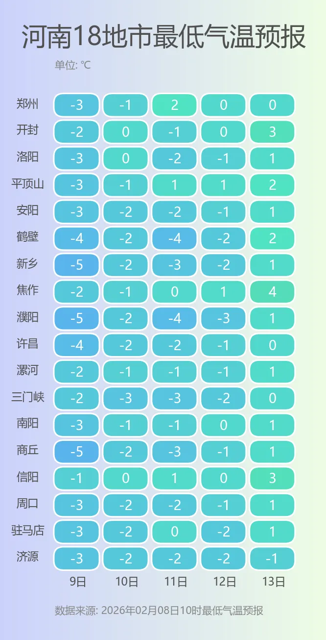 在冷空气的影响下,明天河南大部气温略有下滑,最高气温多在6~8℃,配合上弱雨雪和大风,体感会更冷些。好在下周二(10日)开始,一波大回暖即将到来,尽管期间会有弱冷空气带来小幅气温波动,但升温的进程势不可挡,预计大部地区的最高气温将从明天的不足10℃逐步升至近20℃。最低气温也将缓慢升至冰点以上,早晚间的寒意没有那么重了。