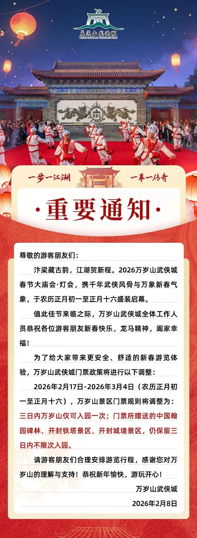2026万岁山武侠城春节大庙会・灯会将于农历正月初一至十六(2月17日~3月4日)举办,其间景区门票政策调整:万岁山3日内仅可入园一次,而门票赠送的中国翰园碑林等3个景区仍保留3日内不限次入园。