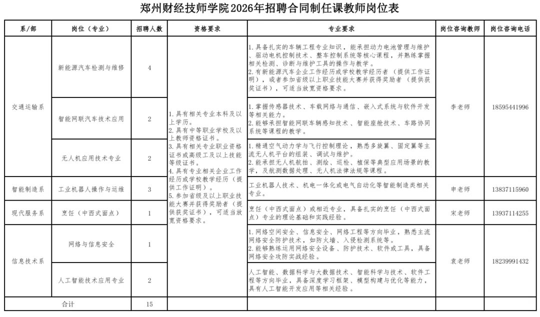 本次招聘合同制任课教师15名,具体岗位及要求详见《郑州财经技师学院2026年招聘合同制任课教师岗位表》(附件1)。招聘外聘兼职教师19名,具体岗位及要求详见《郑州财经技师学院2026年招聘外聘兼职教师岗位表》(附件2)。