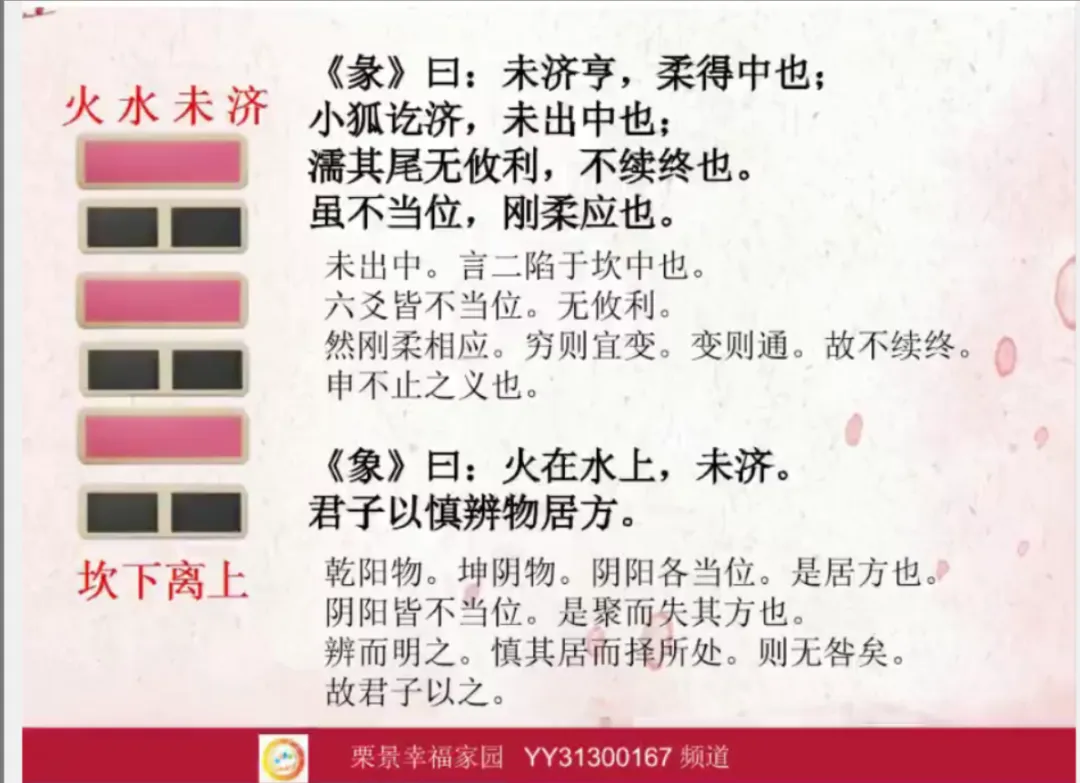 亨,小狐汔济,濡其尾,无攸利。小狐汔济,指将要成功的时候,小狐狸拼命挣扎,费尽全力,终于要到达岸边而接近成功,这个时候,濡其尾,尾巴湿了,从尾巴湿,无攸利,最后一无所成。但是这个一无所成,也不是绝对的。没有长久的的坏,也没有长久的好!万事万物都是无限循环往复的,我们唯一要做的,不错位,不越位,遇事儿内求,深耕自己。易经口袋书下第54页。象曰教具:«河图藏象数方位图»