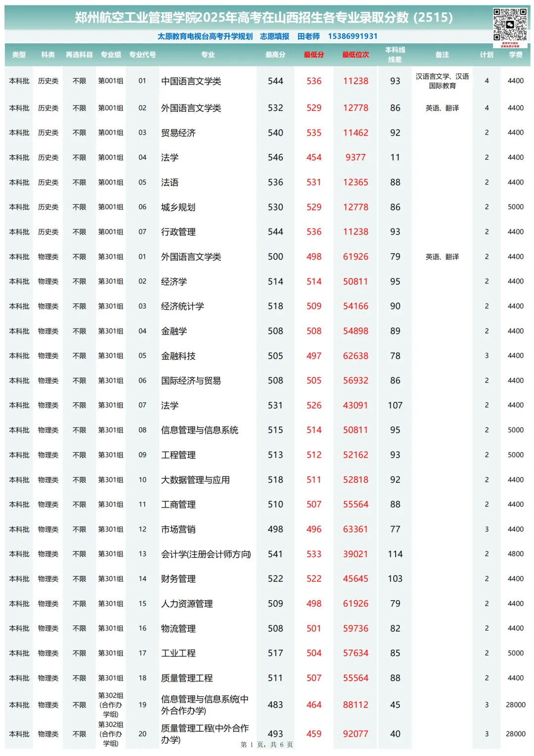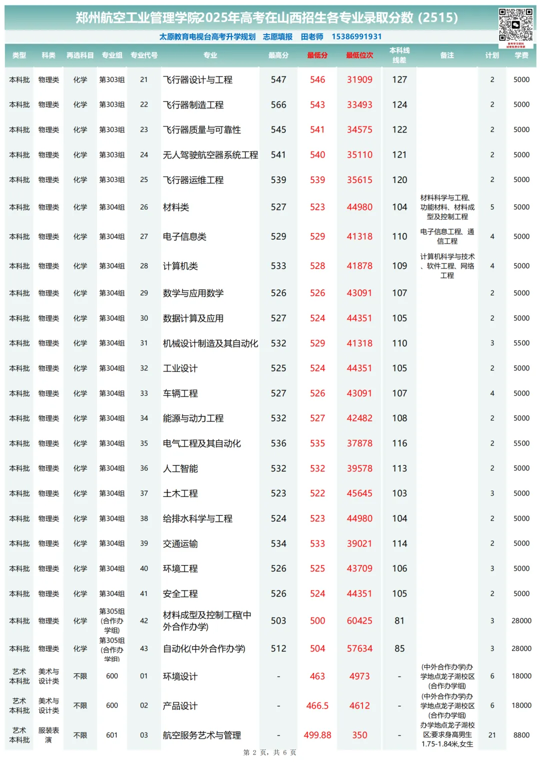 郑州航空工业管理学院2025年高考山西招生各专业录取分数