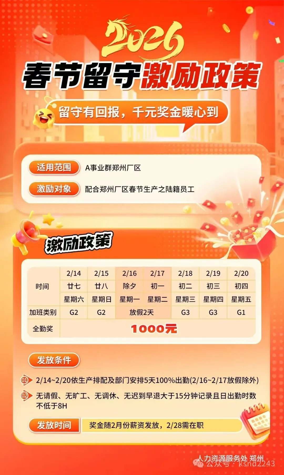💵春节正常放假6天,配合排班出勤有奖励1000元,G2G3有钱赚