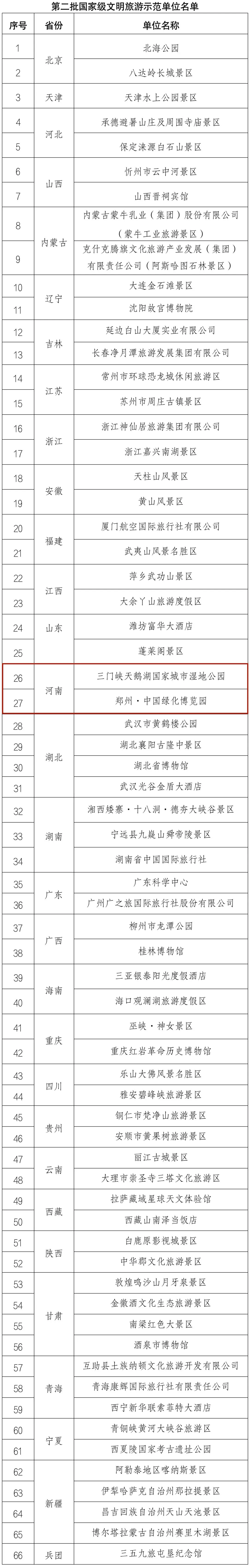 根据《文化和旅游部办公厅关于开展〈文明旅游示范单位要求与评价〉(LB/T 075-2019)实施工作的通知》,全国旅游标准化技术委员会认定,66家单位为第二批国家级文明旅游示范单位(包括2021年因疫情原因未开展实地评定的9家单位和2022年申报的57家单位)。