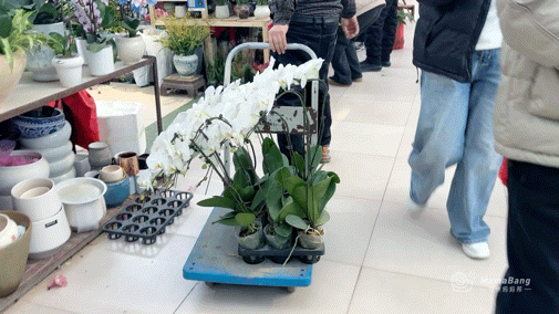 "这盆君子兰五十拿走!""绣球三十不能再少了!"