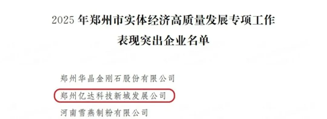 近日,郑州市人民政府印发《关于表扬2025年郑州市实体经济高质量发展专项工作表现突出企业的通报》,对全市在2025年实体经济高质量发展专项工作中表现优异、贡献突出的企业予以表扬。其中,郑州亿达科技新城发展有限公司凭借在产业集聚、创新赋能、服务升级等多方面的显著成效荣登表扬名单,用实干实绩诠释园区担当,为郑州实体经济高质量发展注入强劲动能。